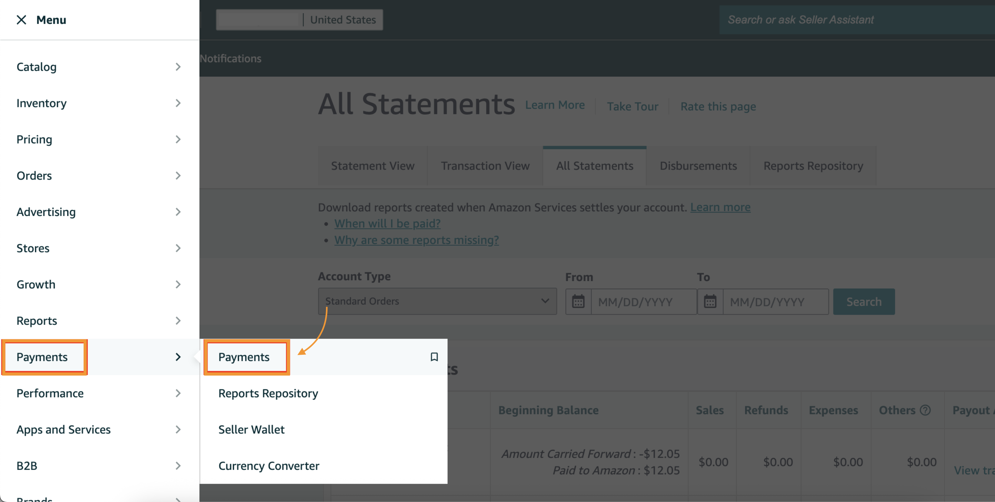 Klicke links im Menü auf Amazon Order oder Amazon Payout