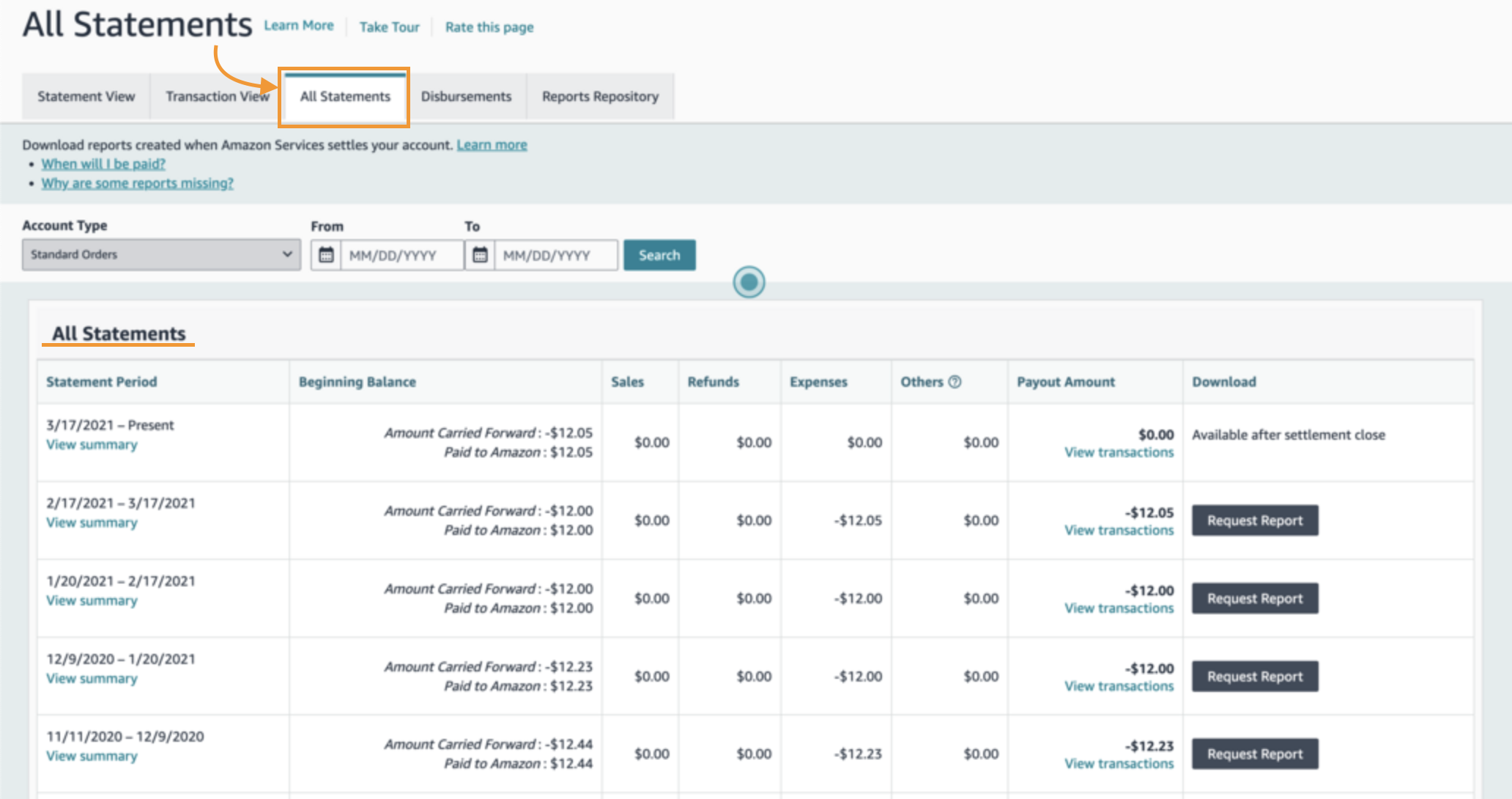 Im Reiter „All Statements“ findest du eine Liste deiner vergangenen Abrechnungszeiträume