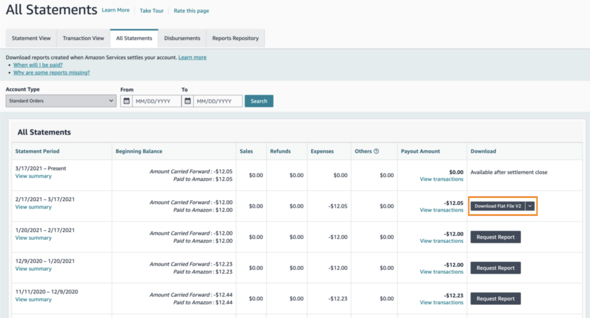 Wenn du darauf klickst, generiert Amazon einen Flat File V2 Report ("In Progress") für diesen Zeitraum.
