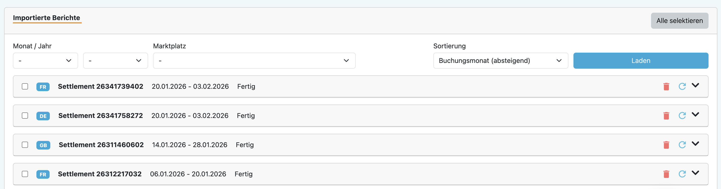 Dort siehst du eine Übersicht aller bereits importierten Settlement Reports