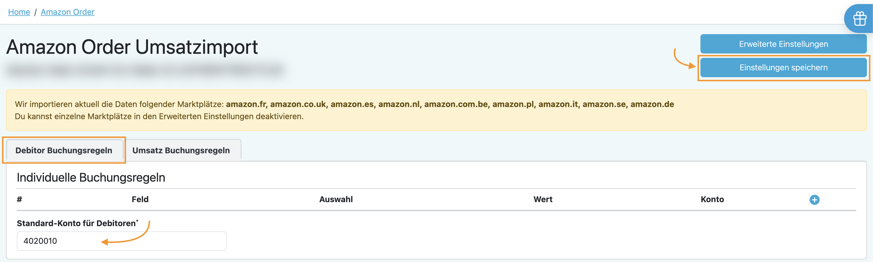 Amazon Order → „Import“ → „Erweiterte Einstellungen"