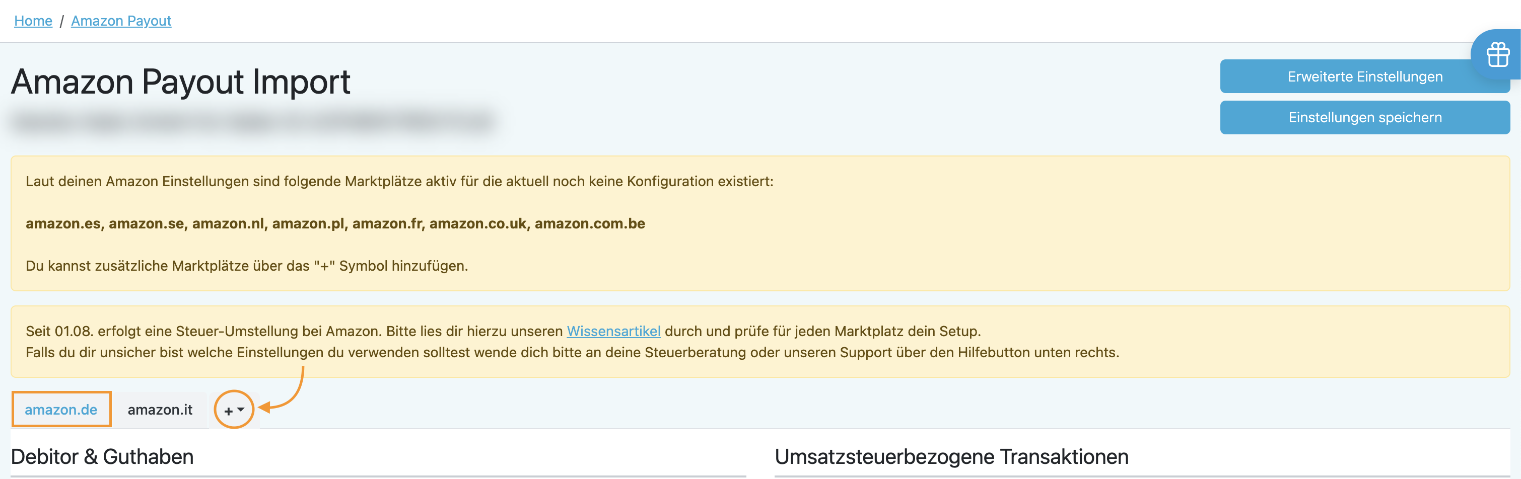Amazon Payout → „Import“ → „+“ Symbol