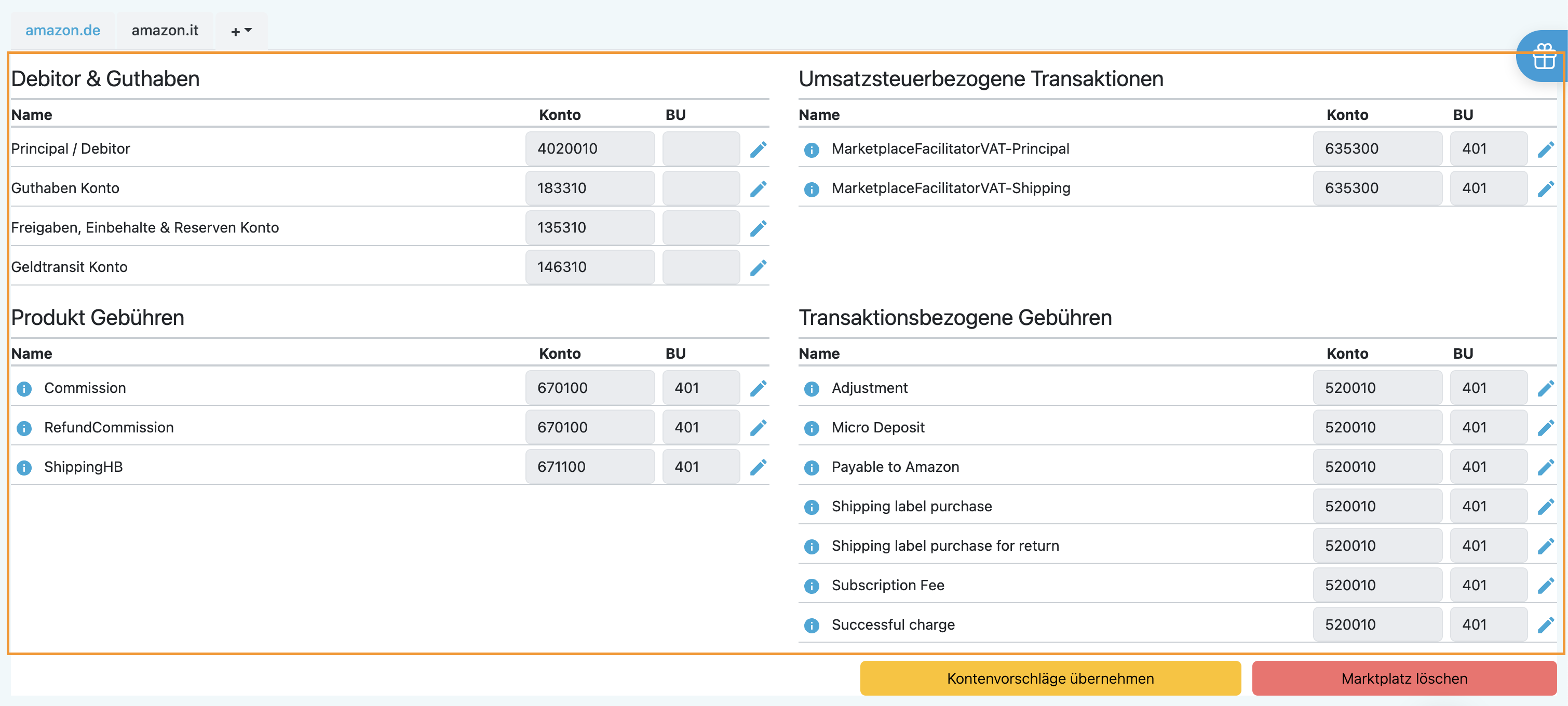 Hinterlege pro Marktplatz die entsprechenden Konten