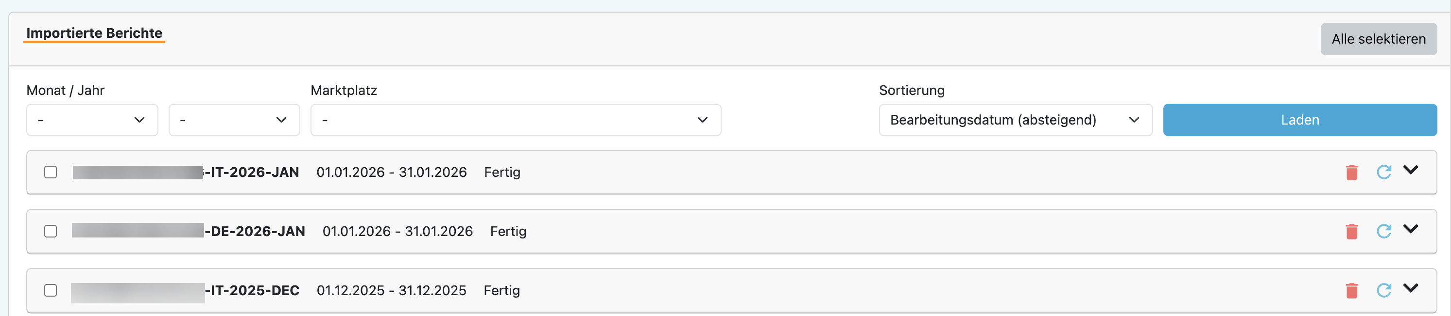 - Welche Berichte bereits importiert wurden & wie der aktuelle Status ("Ausstehend", "in Verarbeitung" oder "Fertig") ist, siehst du ganz unten, bei "Importierte Berichte":
