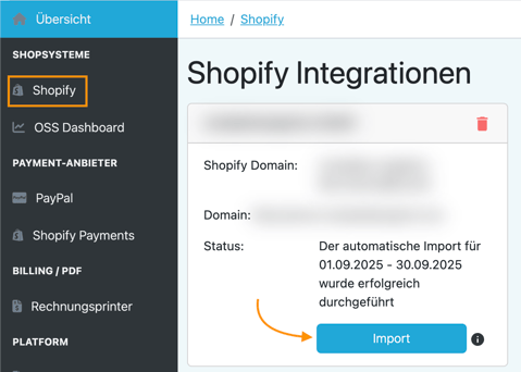 Wähle den gewünschten Shop aus und klicke auf den blauen Button „Import“.