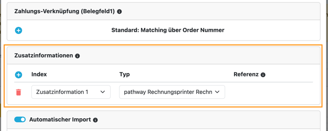 → Klicke dazu auf das blaue Plus und wähle bei Index zwischen Zusatzinformation 1-20 oder der Auftragsnummer aus. Wähle bei Typ "pathway Rechnungsprinter Rechnungsnummer" aus. - 🚨 Scrolle anschließend nach ganz unten und klicke auf "speichern", damit die Änderungen übernommen werden
