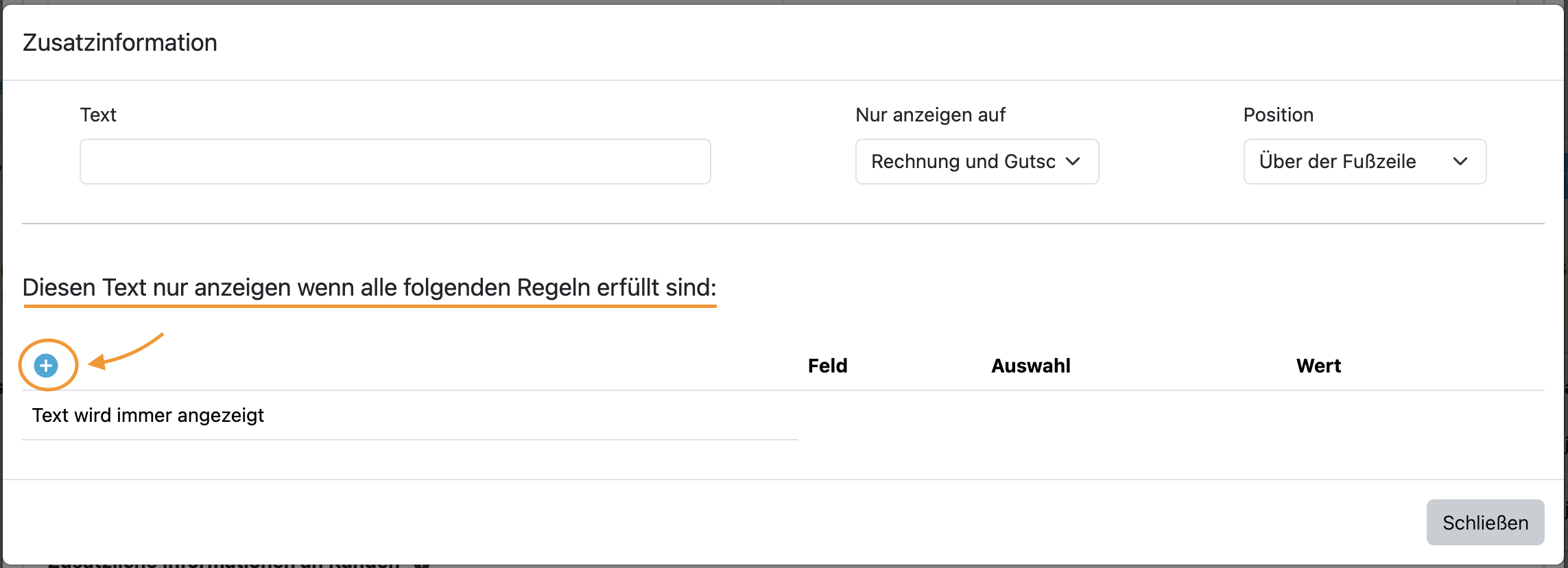 Wenn der Text nicht immer angezeigt werden soll, kannst du optional eine Regel / Bedingung ergänzen.