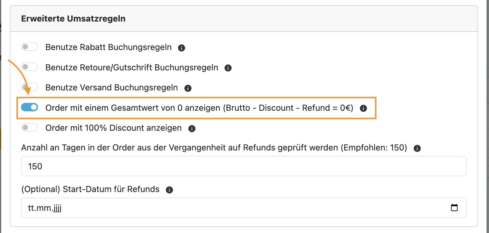 👉🏼 „Order mit einem Gesamtwert von 0 anzeigen (Brutto - Discount - Refund = 0€)“