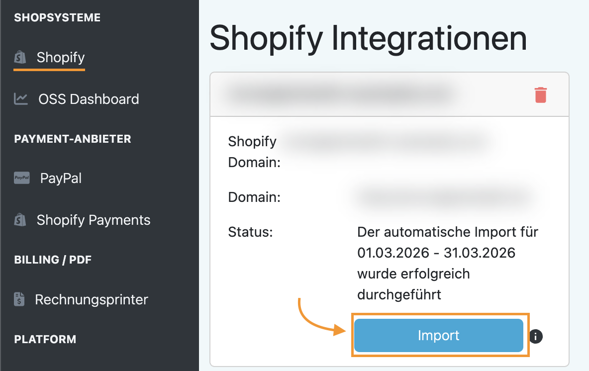 - Klicke bei deinem Shop auf den blauen Button „Import“