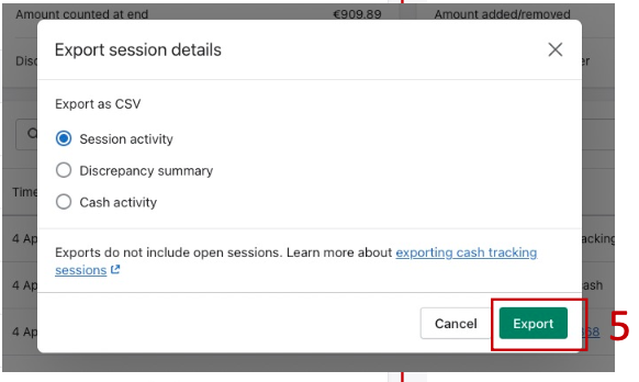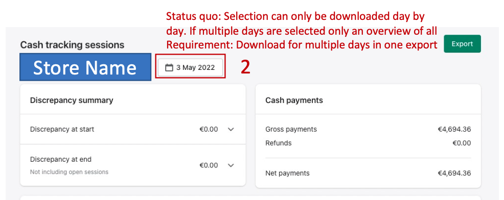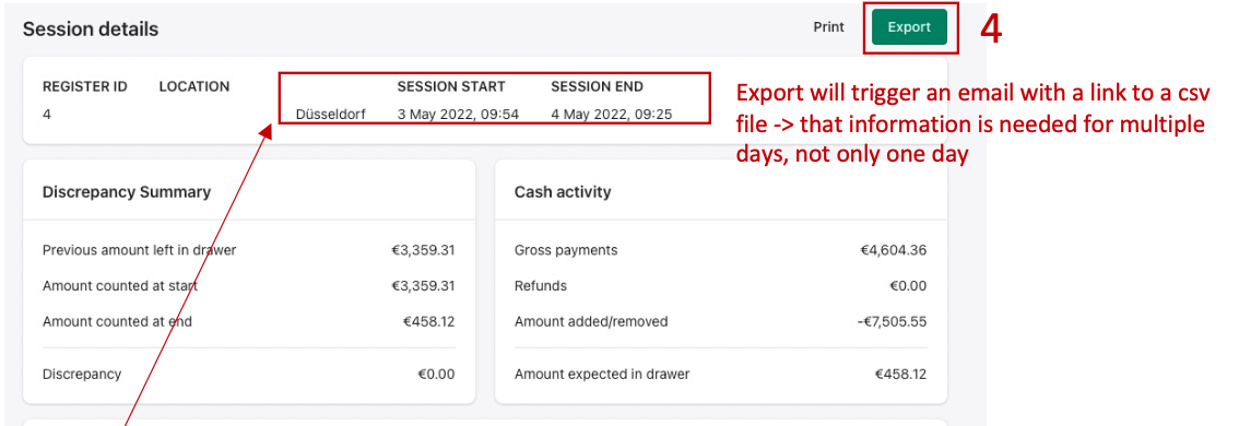 Klicke auf Export, um alle Details der Kassentransaktionen zu erhalten.