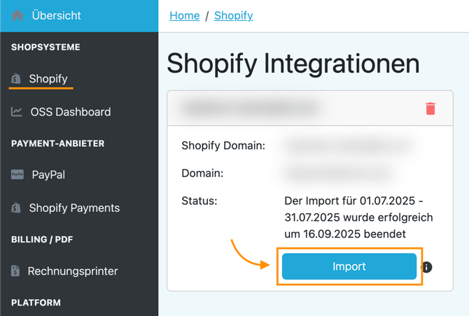 Klicke unter Shopify / WooCommerce bei dem entsprechenden Shop auf Import, um das Setup anzupassen.