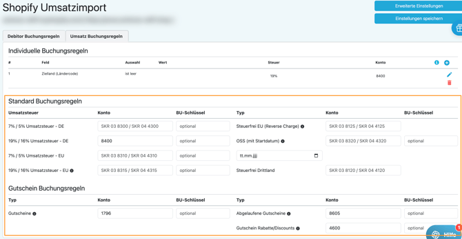 (z.B. für 7%/19% Ust. DE, 7%/19% Ust. EU, Steuerfrei EU (Reverse Charge), OSS, Steuerfrei Dritland oder Gutscheinkonten)