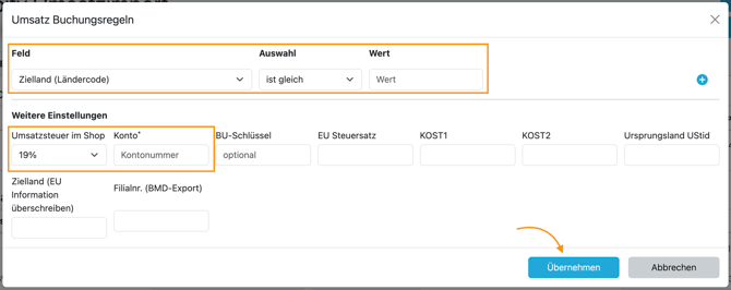 ➡️ Hinterlege den entsprechenden Wert (z.B. Name des Ziellands DE oder Bezeichnung des Order-Tags)
